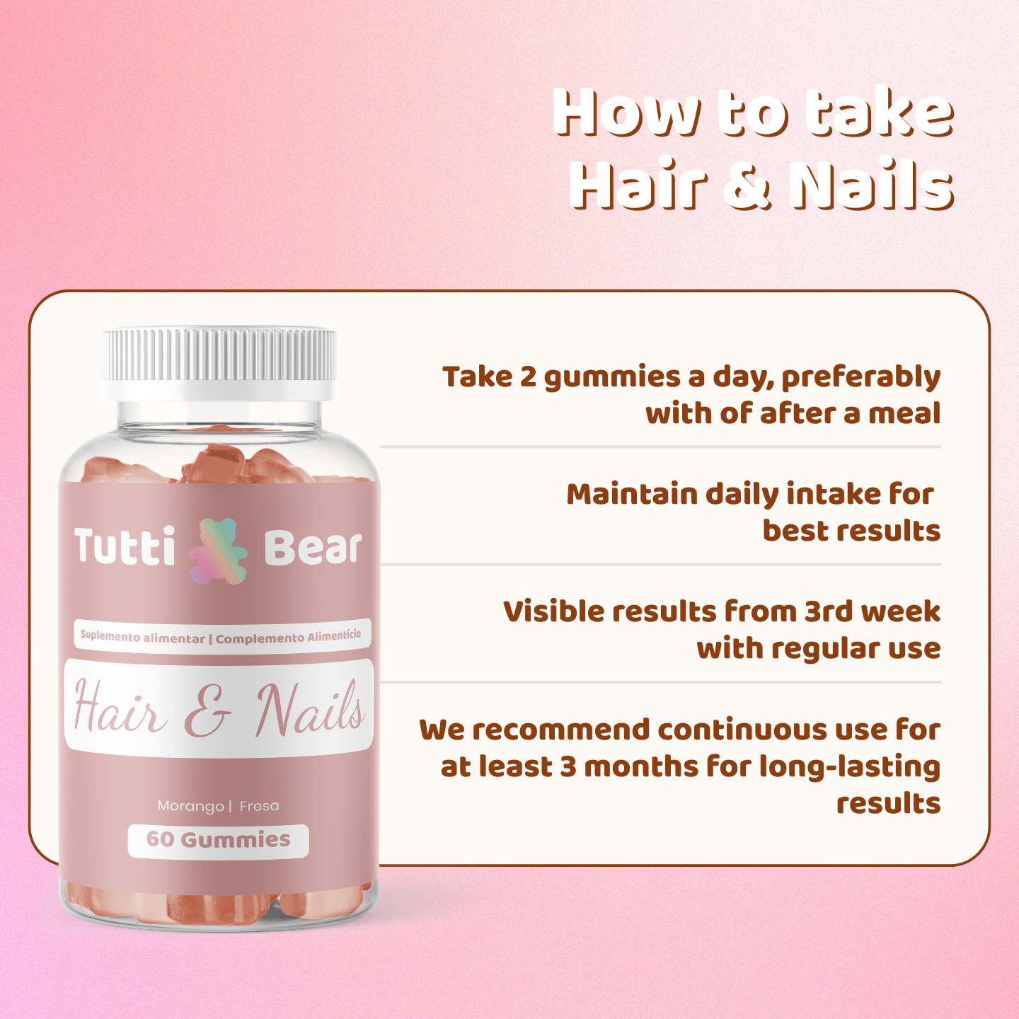 Představujeme vám TuttiBear Gummies pro růst vlasů - vašekaždodenní tajemství delších, silnějších a zdravějších vlasů. Vytvořili jsme účinnou směs vysoce koncentrovaného biotinu, zinku a základních multivitamínů, která je určena k výživě vlasových folikulů u kořínků. Zapomeňte na šampony plné chemikálií, které ošetřují pouze povrch; skutečné zdraví vlasů začíná výživou.