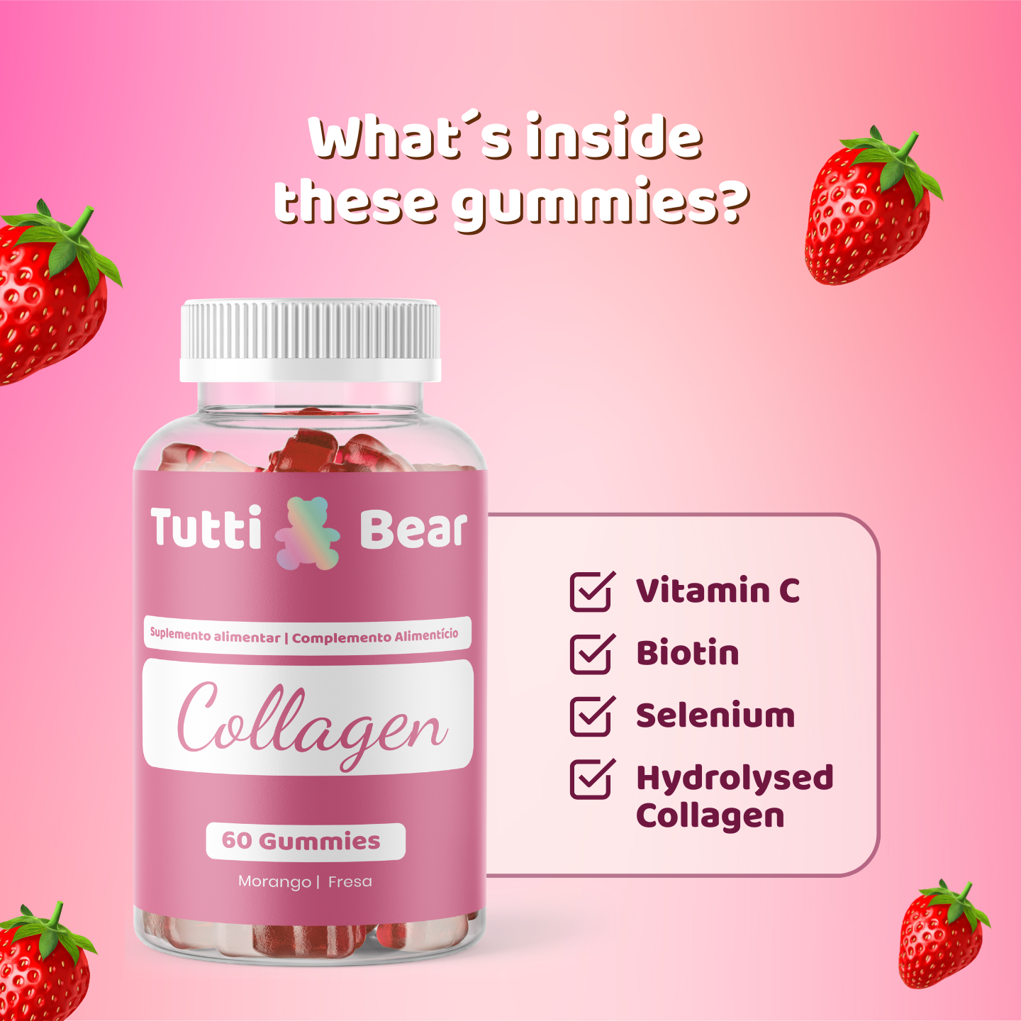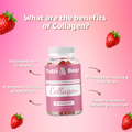 Dimenticate le polverine disordinate che si raggrumano nel caffè o le pillole di grandi dimensioni che sembrano un lavoro di routine. Con le nostre gommine senza zucchero e al gusto di fragola, la cura di sé diventa un piacere, assicurandovi di rimanere costanti nel vostro viaggio verso una pelle radiosa e capelli sani.